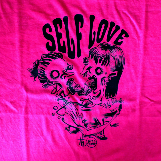 T-shirt rose issu de la seconde-main, revalorisé avec le motif Self Love, collaboration Théophile De Meira x WILD FLOW.